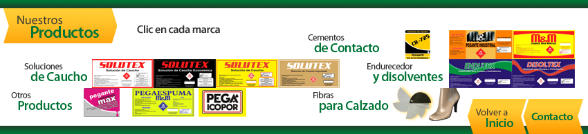 Ir a ContactoVolver a Inicio Fibras para Calzado Otros Productos Otros Productos Otros Productos Endurecedor y Disolventes Endurecedor y Disolventes Soluciones de Caucho Soluciones de Caucho Soluciones de CauchoSoluciones de Caucho Cementos de Contacto Cementos de Contacto Cementos de Contacto